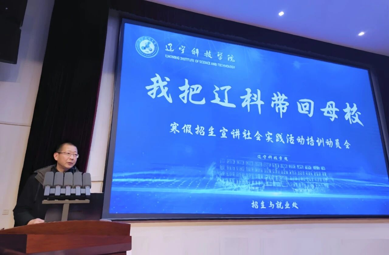 2025年12月30日晚,辽宁科技学院2026年“我把辽科带回母校”寒假招生宣讲社会实践活动培训动员会在勤公楼学术报告厅成功举行。学校招生与就业处副处长卢志鹏、招生办公室主任沈世明,2026年寒招分团长、各实践团队队长,招生就业与校友联络志愿者协会成员等近300人出席本次活动。