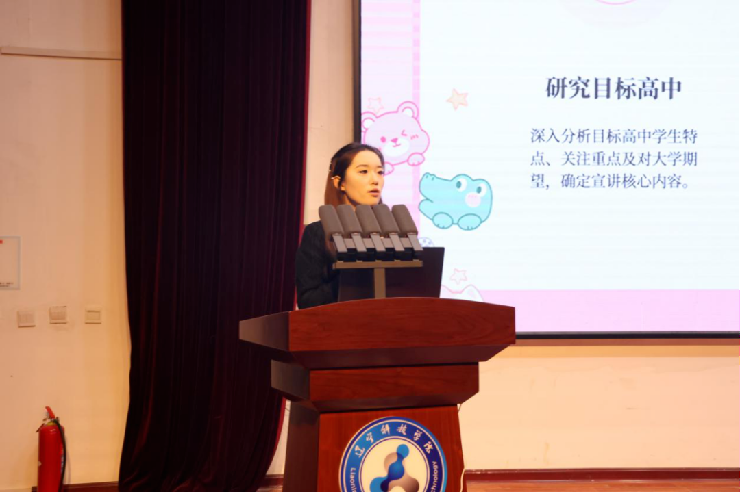 在2025年“我把辽科带回母校”寒假招生宣讲社会实践总结表彰活动中斩获佳绩的团队负责人代表马思源、吕宝萍同学先后上台分享经验。她们结合重返高中母校宣讲的亲身经历,从宣传素材筹备、与高中师生沟通技巧、宣讲内容的精准选择及手段运用、后续考生思想动态跟踪等方面展开分享,用鲜活案例与实用建议为在场师生提供了详实参考,令大家受益匪浅,赢得阵阵掌声。