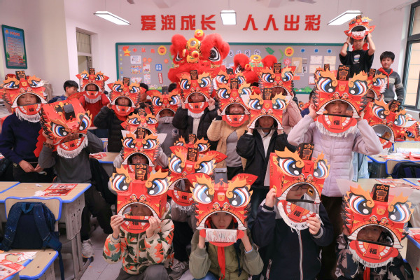 图为孩子们戴着自制的“狮子头”合影 摄影:陈雯茜