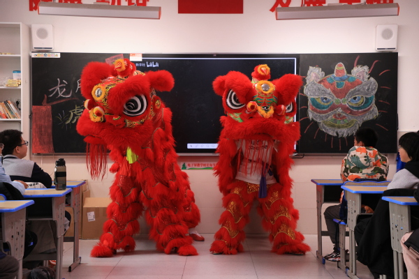 随后的舞狮表演将气氛推向高潮。由4名大学生扮演的两只“狮子”活灵活现,穿梭于课桌之间,孩子们笑声不断,纷纷上前与“狮子”亲密互动,现场气氛热烈。