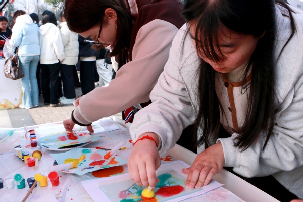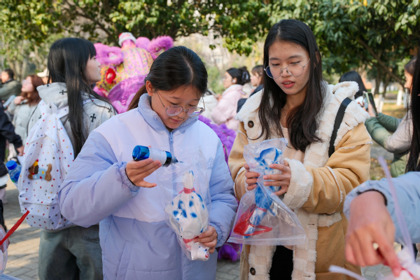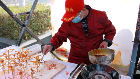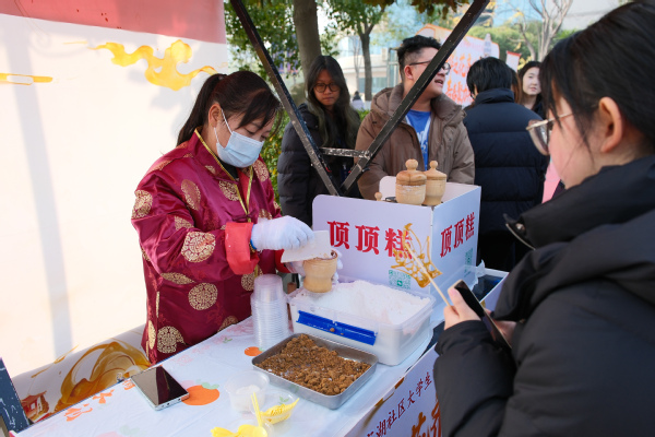冰糖葫芦自己熬、五彩扎染亲手做、灵动糖画现场绘……12月18日中午,武汉工商学院静思湖畔广场变身“非遗体验馆”,一场别开生面的大学生中华文化艺术节在这里火热举行,吸引了武汉科技大学、湖北中医药大学、武汉交通职业学院等周边多所高校的学生们排队体验,亲手“触摸”传统文化,感受非遗魅力。
