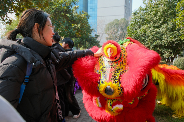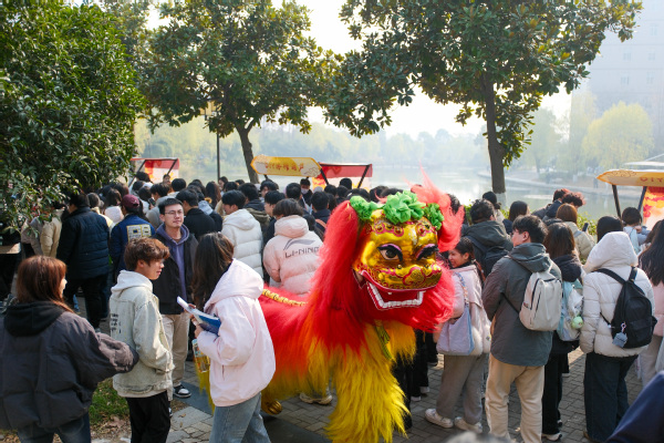 中午12时,锣鼓声起,醒狮欢腾。由武汉工商学院精英龙狮社带来的开场表演瞬间点燃气氛,不少学生举起手机记录,更有学生上前互动,传统民俗与青春活力碰撞出灿烂火花。