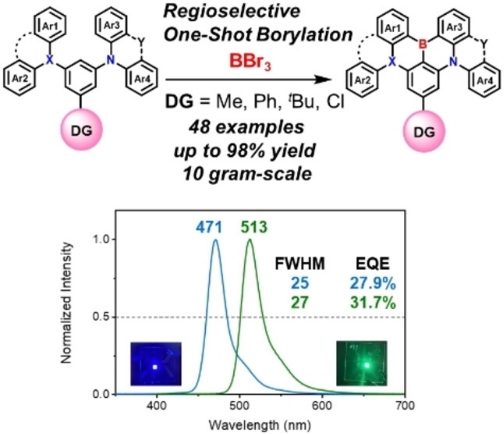 利用“导向基定位直接硼化”策略,实现了窄光谱发光材料的高效合成。