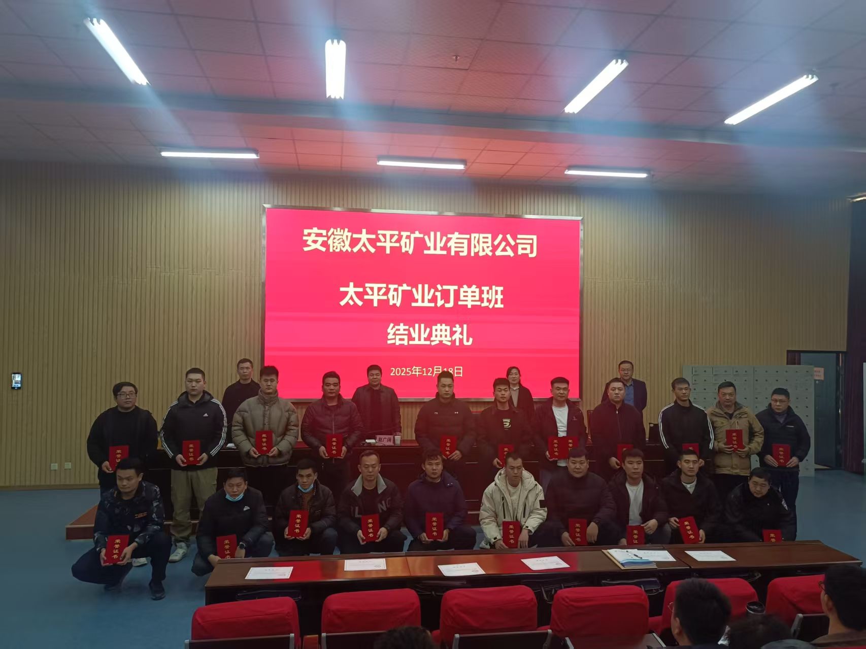12月18日下午,安徽太平矿业有限公司与安徽淮北煤电技师学院联合举办的订单班结业典礼在学院党校报告厅顺利举行。安徽太平矿业安全总监赵广阔、安环部副部长翟圻,学院培训部部长高素芹等出席典礼。