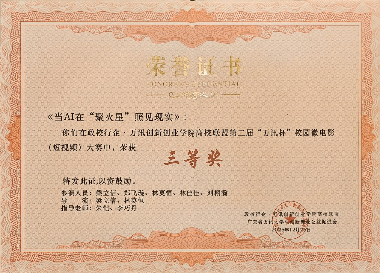 近日,政校行企・万讯创新创业学院高校联盟第二届“万讯杯”校园微电影(短视频)大赛圆满落幕。我校聚火星工作室创作的《当AI在“聚火星”照见现实》凭借鲜明的时代主题、扎实的专业呈现与亮眼的创新实践,在全国高校选送的306部作品中脱颖而出,成功斩获三等奖,用光影之力诠释了党建引领下“人工智能赋能教育发展”的生动实践。