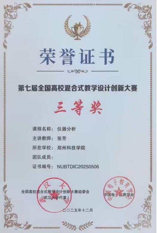 近日,第七届全国高校混合式教学设计创新大赛获奖名单正式公布。郑州科技学院教师张芳主讲的《仪器分析》课程获三等奖,冯丽娟主讲的《传感器原理及应用》课程获优胜奖,展现了学校在混合式教学改革方面的扎实积累与有效成果。
