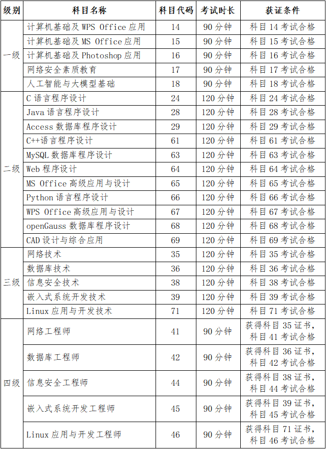 1.我省开考全部级别,2025年9月新增一级人工智能与大模型基础和二级CAD设计与综合应用两个新科目。考试大纲及教材可登录中国教育考试网查看,具体考试级别科目设置及证书体系如下: