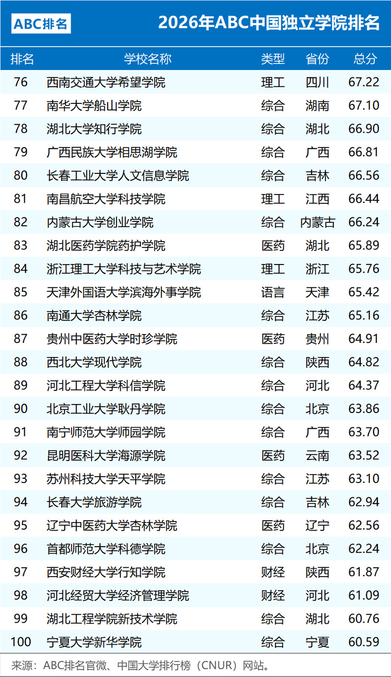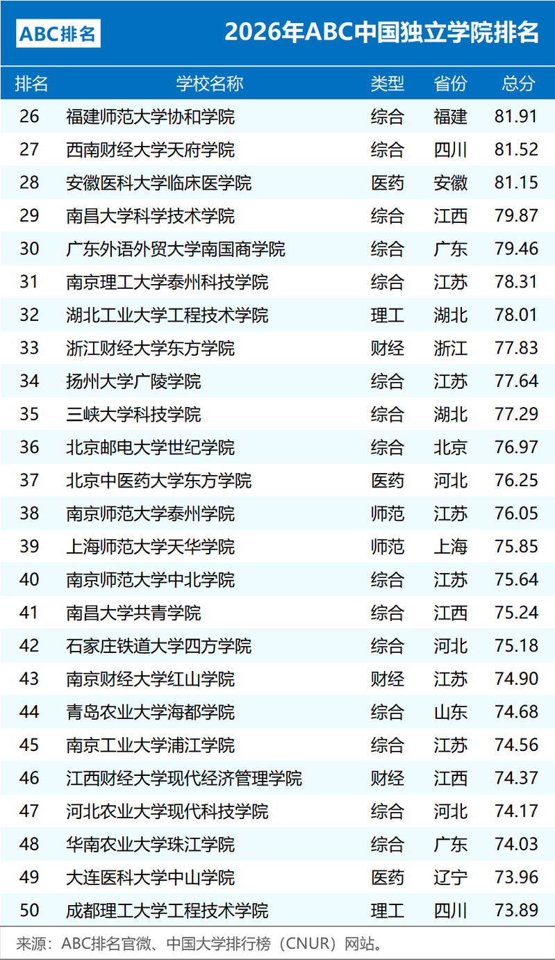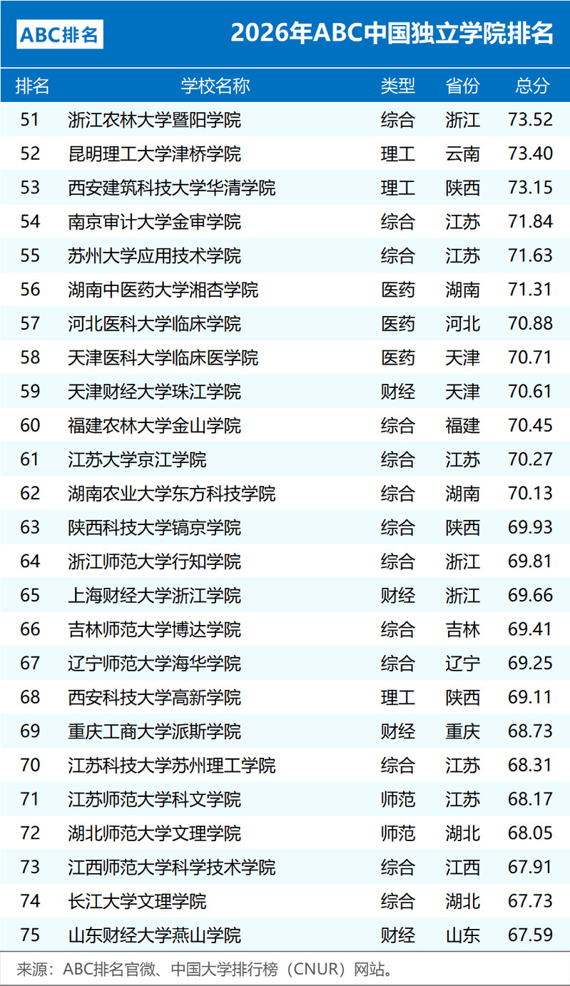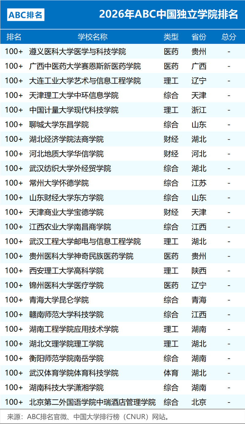 1月4日,中国大学排行榜(CNUR)网站正式发布了2026年ABC中国独立学院排名,共有125所独立学院上榜,较上一年度增加10所。 ABC中国独立学院排名由ABC咨询机构独家编制,作为ABC排名系列榜单年度重磅研究成果,该榜单宏观体现独立学院综合竞争力。ABC排名媒体和学术影响力深远,包括人民网、光明网、凤凰网以及各大日报等权威媒体进行了深度报道,实现排名结果全网全覆盖,权威性和影响力在国内处于领先梯队。排名方法 ABC中国独立学院排名,侧重于办学层次、人才培养、教学建设、师资队伍等模块内的应用型二级指标,办学基础数据和年度热点相结合,注重培养过程,兼顾母体学校影响力。数据来源广泛并具有可查性,包括学校信息公开、本科教学质量报告、职能部门官网等。