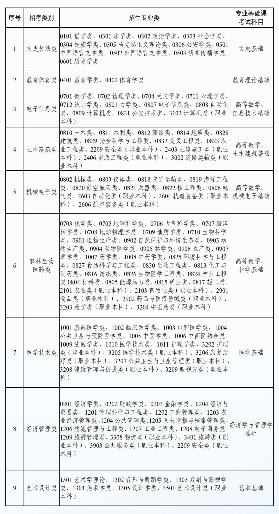 2.考试类别。考试类别包括文史哲法类、机械电子类、电子信息类、土木建筑类、农林生物医药类、医学技术类、经济管理类、教育体育类、艺术设计类9个大类,考生选择1个考试类别报名考试。报考本科医学类专业的考生,所学高职(专科)医学类专业名称应与本科专业名称相同(专科中医骨伤专业升本时对应本科中医学专业)。