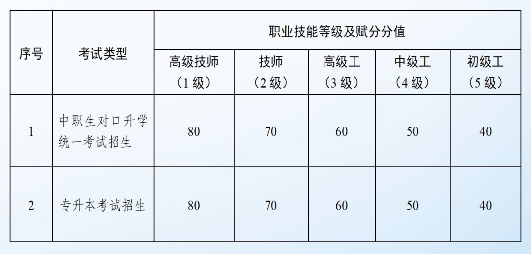 6.技能赋分。专科阶段获得的职业技能竞赛奖项、职业技能等级2个项目,将通过赋分方式转换每个项目的成绩。该成绩计入专升本考试总成绩,且2个项目成绩可累加计算。考生取得的职业技能竞赛获奖项目、职业技能等级,须与报考的考试类别相关方可赋分。