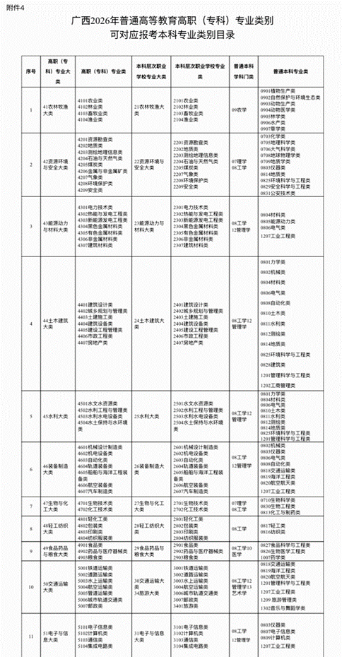 4.广西2026年普通高等教育高职(专科)专业类别可对应报考本科专业类别目录