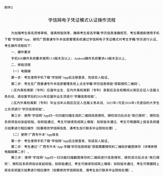 3.我区专升本考试报名将通过学信网“电子凭证模式”对所有考生电子学籍/学历进行认证,请考生提前使用手机下载“学信网”App并进行扫码认证(操作流程见附件2)。考生的学籍/学历信息以学信网登记为准,请考生提前核实,如有差错,务必与本人高职(专科)毕业院校联系,并于报名前在学信网进行更正。如因此造成不能报名、录取的后果,由考生负责。