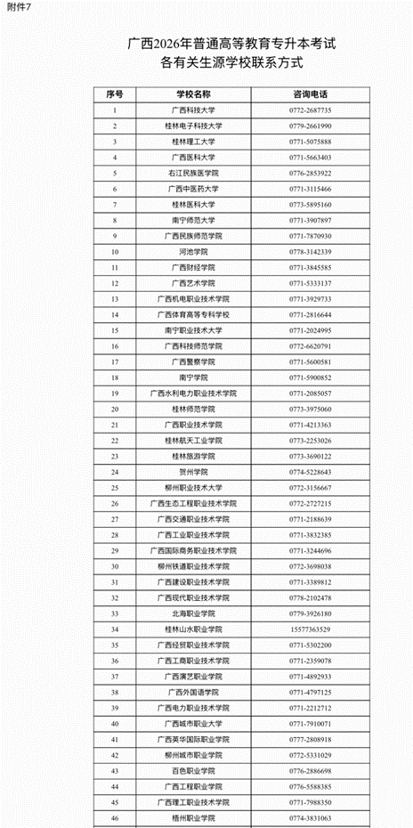 7.广西2026年普通高等教育专升本考试各有关生源学校联系方式