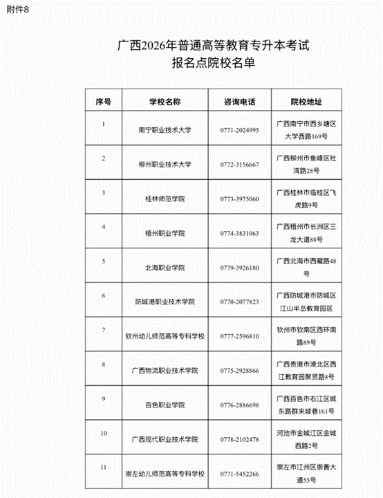 8.广西2026年普通高等教育专升本考试报名点院校名单