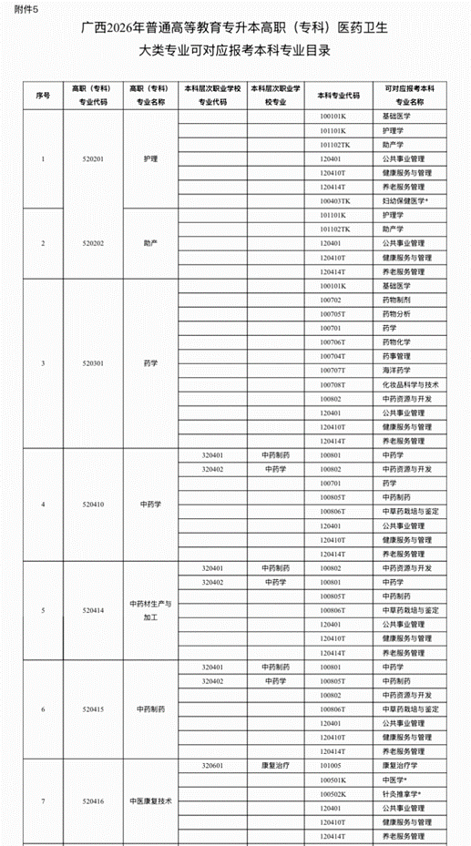 5.广西2026年普通高等教育专升本高职(专科)医药卫生大类专业可对应报考本科专业目录