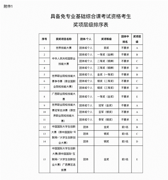 附件:1.具备免专业基础综合课考试资格考生奖项层级排序表