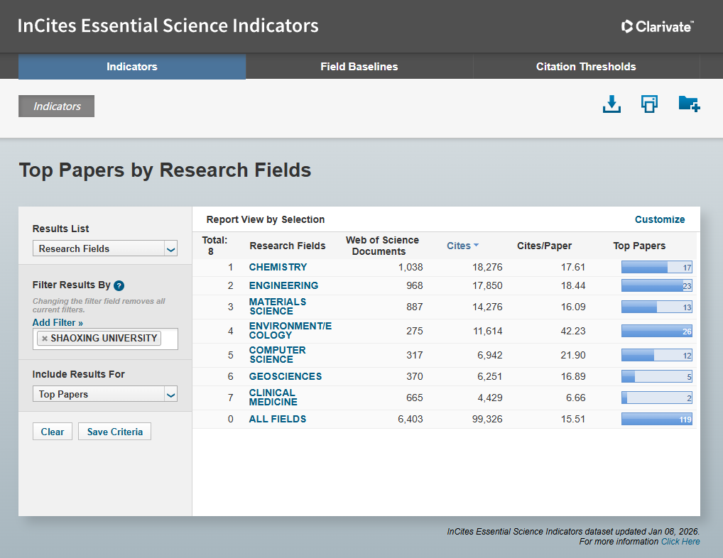 科睿唯安(Clarivate Analytics)近日发布了2026年1月ESI(基本科学指标数据库)最新数据。数据显示,我校地球科学(Geosciences)与临床医学(Clinical Medicine) 两个学科首次进入ESI全球前1%学科行列。 至此,我校进入ESI全球前1%的学科数量已增至7个。7个学科分别是:工程学、化学、环境科学/生态学、计算机科学、材料科学、地球科学、临床医学。根据最新数据统计,我校入选学科数量位于省内高校前列。
