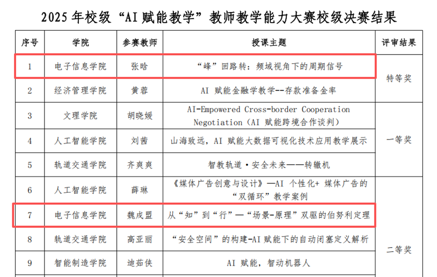 此次获奖,既是对两位老师个人教学能力与创新探索的充分肯定,更是我院持续推进“AI+教育”教学改革、深化“产教融合、课证融通”育人模式的重要成果彰显。未来,电子信息学院将继续以各类教学赛事为重要抓手,坚持 “以赛促教、以赛促改、以赛促优” 的育人理念,进一步推动人工智能赋能专业教学,鼓励全体教师积极探索创新教学方法与育人模式,不断提升人才培养质量与教学核心竞争力,为学校高质量发展注入源源不断的强劲动力!
