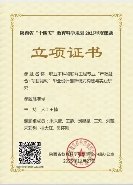 继2024年陕西教育科学研究院项目零突破后,2025年,任冰副教授和王楠副教授各自主持的《职业教育数字化转型背景下职业本科集成电路高端技能人才教学体系建设研究》《职业本科物联网工程专业“产教融合+项目驱动”毕业设计创新模式构建与实践研究》2个项目再次喜获立项。