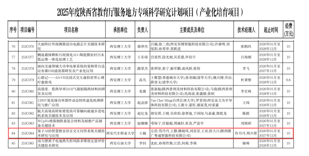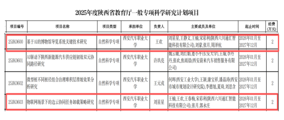 继2025年初厅级立项突破后,年底王楠副教授主持的省教育厅产业化培育项目《基于AI的智慧教室语音交互问答系统关键技术研究与应用》、青年教师王欢、刘星星各自主持的《基于AI的博物馆导览系统关键技术研究》和《物联网场景下的边云协同任务卸载策略研究》3个项目成功立项。