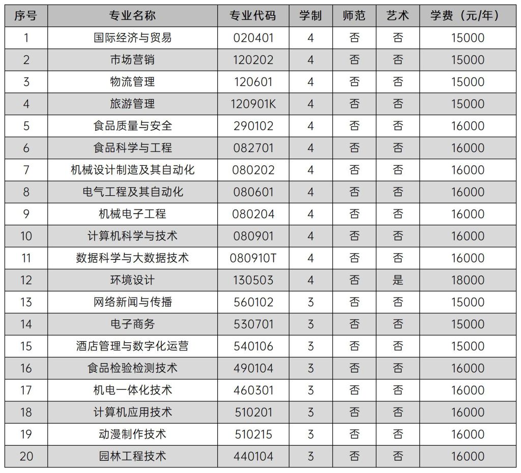 第十九条学校严格执行河南省发展和改革委员会、河南省教育厅审批备案的收费标准。对口本科学费:国际经济与贸易、市场营销、物流管理、旅游管理专业15000元/生· 年,食品质量与安全、食品科学与工程、电气工程及其自动化、机械设计制造及其自动化、机械电子工程、计算机科学与技术、数据科学与大数据技术专业16000元/生·年,环境设计专业18000元/生·年;对口专科学费:网络新闻与传播、电子商务、酒店管理与数字化运营专业15000元/生·年,计算机应用技术、动漫制作技术、食品检验检测技术、园林工程技术、机电一体化技术专业16000元/生·年,住宿费:1500元/生·年(六人间)。