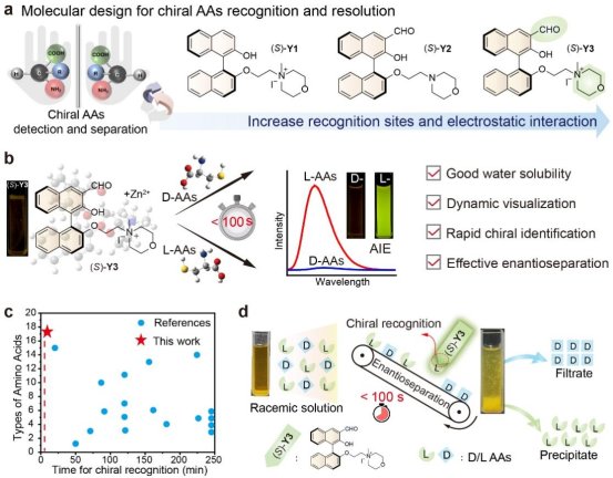 游离氨基酸的对映选择性识别与手性分离在生命科学、食品科学、化学工业、药物分析等领域具有至关重要的意义。尽管目前已有传统的手性分离技术(如手性色谱法),但通常分析步骤繁琐,难以实现实时或原位检测。荧光传感技术因其高灵敏度、快速响应和操作简便等优势,为手性识别提供了一种具有广阔前景的替代方案。然而,开发能在水中同时实现游离氨基酸快速对映选择性识别与手性分离的荧光探针,仍是一项极具挑战性的研究工作。