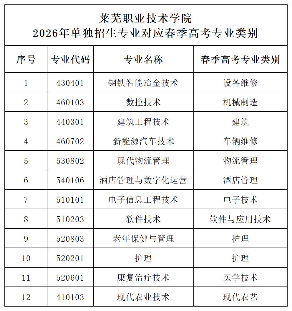 莱芜职业技术学院2026年单独招生计划250人,招生专业12个,涉及春季高考专业类别11个。具体招生专业对应春季高考专业类别如下: