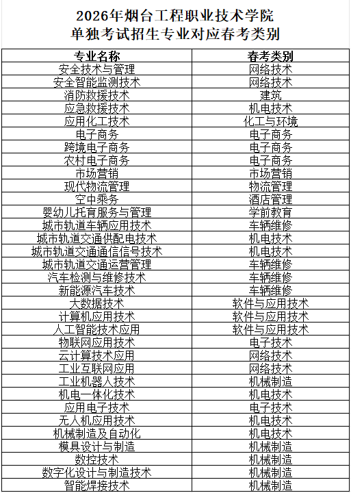 烟台工程职业技术学院2026年单独考试招生专业对应春考类别