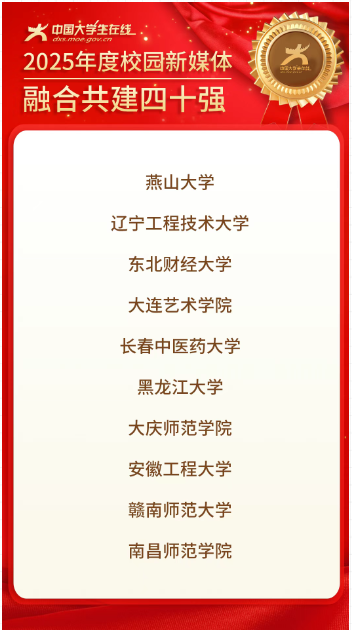 1月8日,教育部中国大学生在线正式公布2025年度校园新媒体融合共建表彰名单,我校荣获“校园新媒体融合共建四十强”称号,彰显了学校校园新媒体建设的显著成效与广泛影响力。