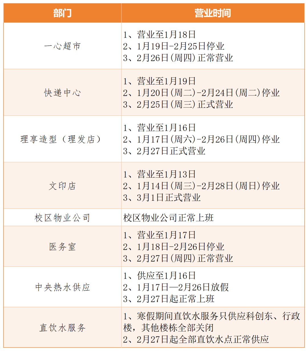 (一)宿舍封闭时间为1月15日(星期四)上午9:00,宿舍开放时间为2月27日(星期五)上午9:00。为确保宿舍安全,学生离校期间要关水、电闸,锁好门窗,最后离开宿舍的同学到门岗处领取封条封闭宿舍。
