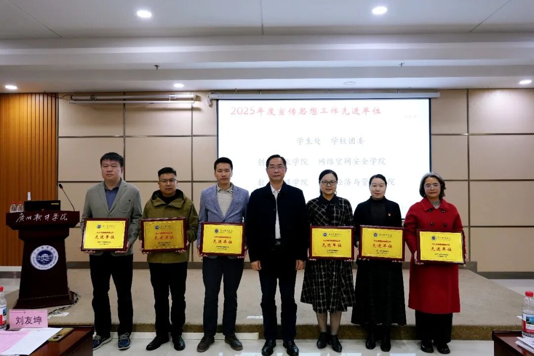 刘友坤用“三个实”充分肯定了2025年学校宣传思想文化工作:一是思想引领“根基实”,二是宣传赋能“成效实”,三是舆情防控“举措实”,并称赞学校宣传思想文化队伍是一支“政治过硬、本领高强、能打硬仗、值得信赖的‘广软铁军’”。