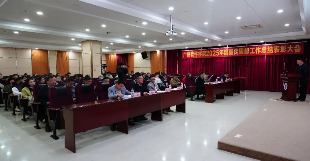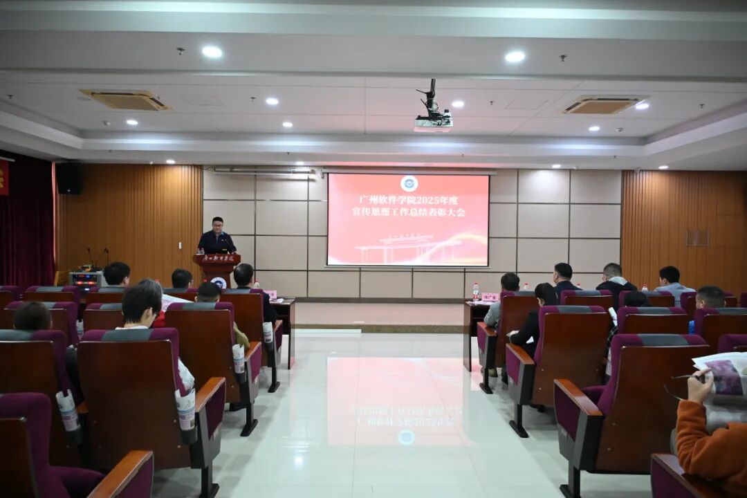 1月5日,广州软件学院在国际报告厅召开2025年度宣传思想工作总结表彰大会。大会全面总结了过去一年学校宣传思想文化工作的成绩与经验,表彰了一批先进集体和个人,并对新一年的工作进行了部署。学校党委书记兼督导专员刘友坤,党委副书记、纪委书记张广金,党委办公室、党委宣传部、党委学生工作部、党委武装部、校团委负责人,各二级学院党政负责人、宣传委员,直属支部书记,校属各二级单位分管新闻宣传工作的领导及教工通讯员,受表彰师生参加会议。大会由党委宣传部副部长钟志坚主持。
