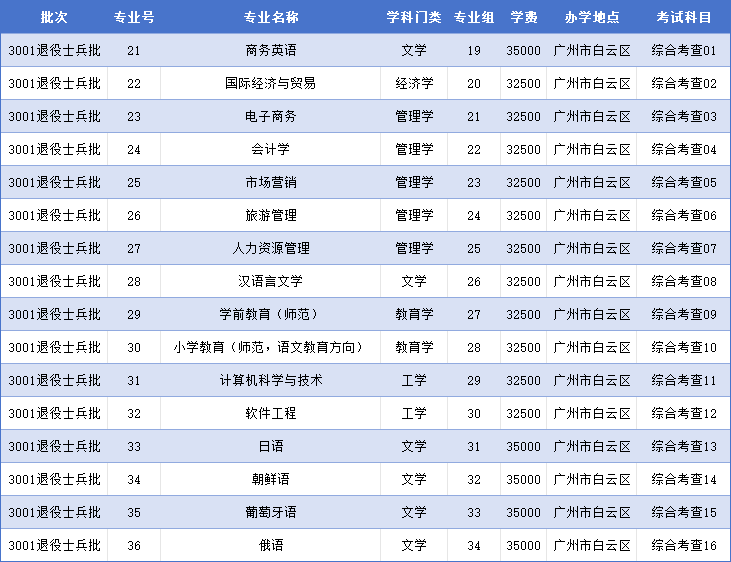 学校退役大学生士兵免试专升本面向广东省招生,招生计划以广东省教育考试院公布的信息为准。具体招生专业信息如下表: