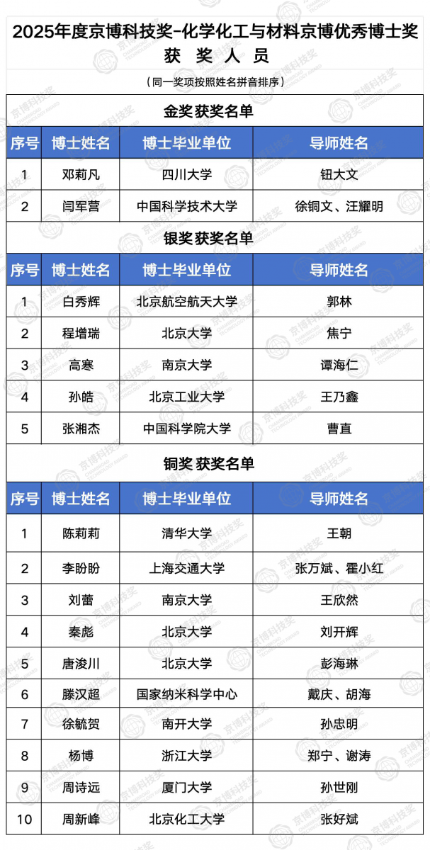 根据《京博科技奖条例》的执行规定,启动2025年度京博科技奖-化学化工与材料京博优秀博士奖的推荐申报及评审工作。经分组函评和现场答辩两轮评审,京博科技奖评审委员会决议,正式公布2025年度化学化工与材料京博优秀博士奖获奖名单。