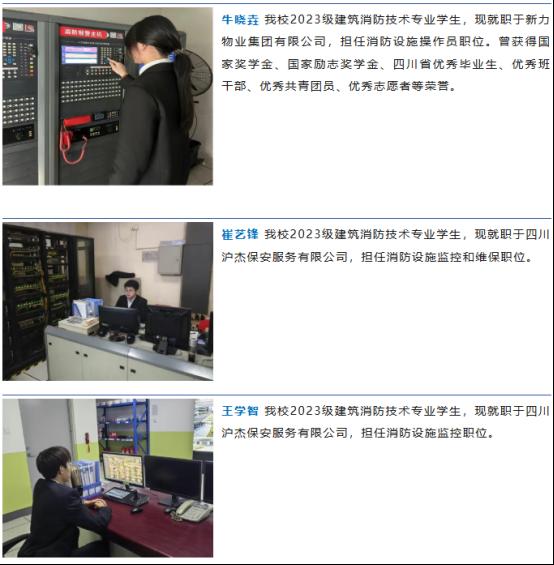 学校已与四川沪杰保安服务有限公司、四川朋创消防科技有限公司、广东胜安教育科技集团有限公司、资阳市消防救援支队、四川三秦绥丰科技有限公司等消防企业单位签约合作,为学生提供实操培训和实习就业平台。学生毕业之后可以选择进入签约合作企业工作或自主选择专业对口的相关企业和部门实习和就业。在公共事业单位、设计院、消防工程公司、消防设备检测中心、建筑施工企业、招投标咨询公司、工程监理公司等区域工作。