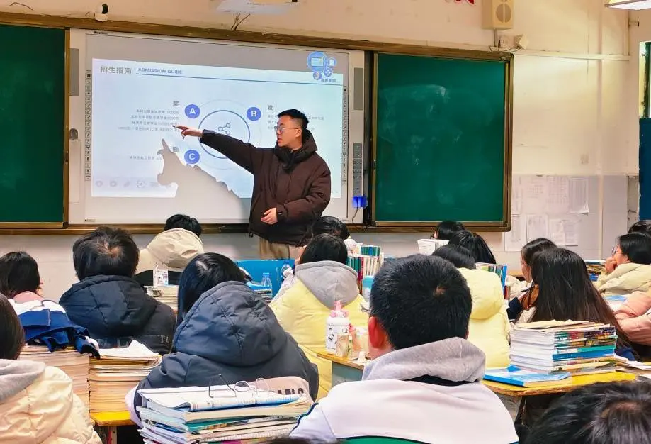 (宣讲团成员分发材料) 上高中学彭毅老师是我院2025届优秀校友。他表示,宣讲内容充实、针对性强,既帮助中学生全面了解我校办学实力与专业特色,也为其提早树立学业目标、明确发展方向提供了有力指导。此类高校与中学的联动,有效打破信息壁垒,搭建起学生认知大学专业的重要平台。彭老师期待未来能与我校建立常态化交流机制,开展更多形式的育人合作,共同助力学生成长成才。