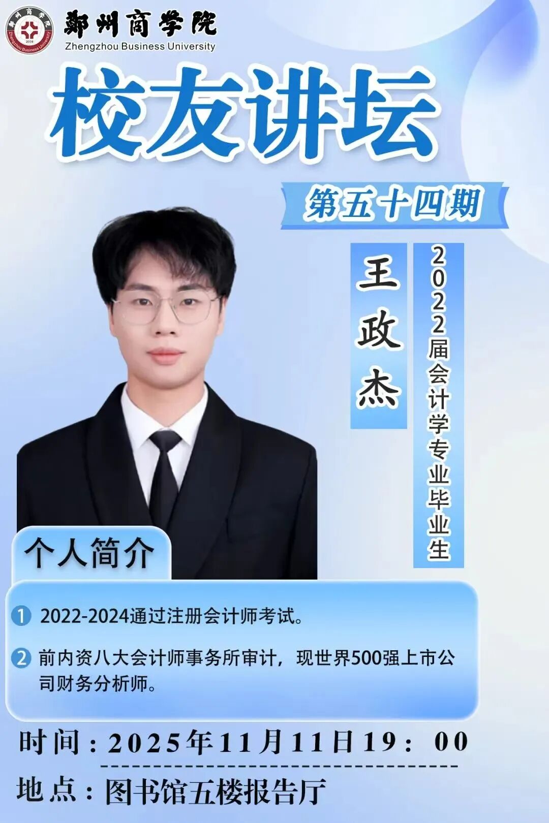 为搭建校友与在校学子的沟通桥梁,助力在校生明晰职业发展方向,11月11日,由招生就业处主办、会计学院承办的校友讲坛第五十四期在图书馆五楼报告厅顺利举行。本次讲坛特邀优秀校友王政杰为在校学子带来一场干货满满的CPA备考指导和就业指南。王政杰校友凭借扎实的专业能力与进取精神,于2022—2024年顺利通过注册会计师考试,在会计专业领域实现核心能力突破;拥有内资八大会计师事务所审计工作经历,现任职于世界500强上市公司财务分析师岗位,完成了从专业职场新人到资深财务从业者的进阶。