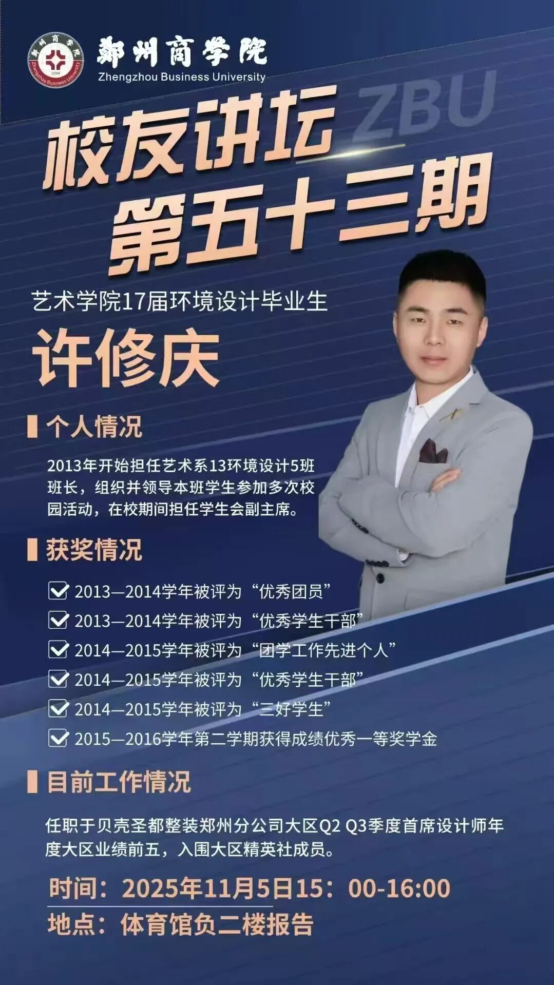 为搭建校友与在校学子的沟通桥梁,助力在校生明晰职业发展方向,11月5日,由招生就业处主办、艺术学院承办的校友讲坛第五十三期在体育馆负二楼报告厅顺利举行。本次讲坛特邀我校2017届环境设计专业优秀毕业生、贝壳圣都整装郑州分公司大区首席设计师许修庆校友担任主讲,艺术学院团委书记杨瑞瑞、环艺教研室主任马前进以及相关专业教师、辅导员、学生共同到场,聆听行业前沿动态,感受校友成长力量。许修庆校友在校期间便展现出对设计领域的浓厚兴趣与扎实学习能力,步入职场后,凭借过硬的专业功底与不懈奋斗精神迅速崭露头角。