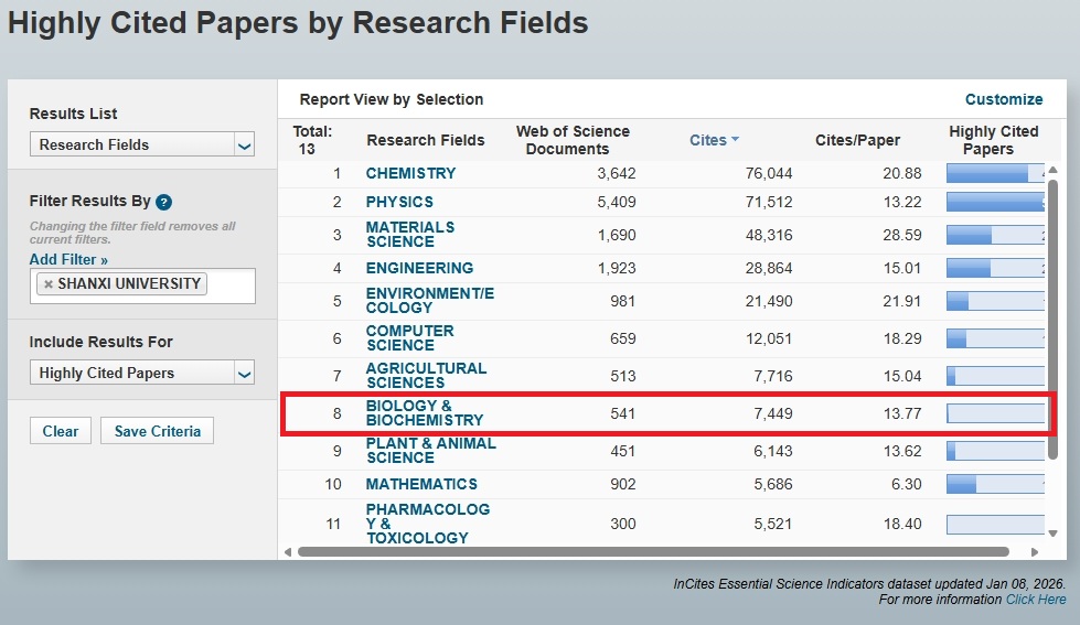 根据科睿唯安(Clarivate Analytics)基本科学指标数据库(Essential Science Indicators,简称ESI)2026年1月8日公布的最新数据,我校新增生物学与生物化学学科入选ESI全球前1%。生物学与生物化学学科在进入ESI全球排名前1%的1701个机构中位居1699位,被WoS核心合集收录论文数为541篇,总被引次数为7449次,篇均被引次数为13.77次。目前,学校共有12个学科进入ESI全球前1%行列,分别是化学、物理学、材料科学、工程学、环境/生态学、计算机科学、农业科学、植物学与动物学、数学、社会科学、药理学与毒理学、生物学与生物化学。
