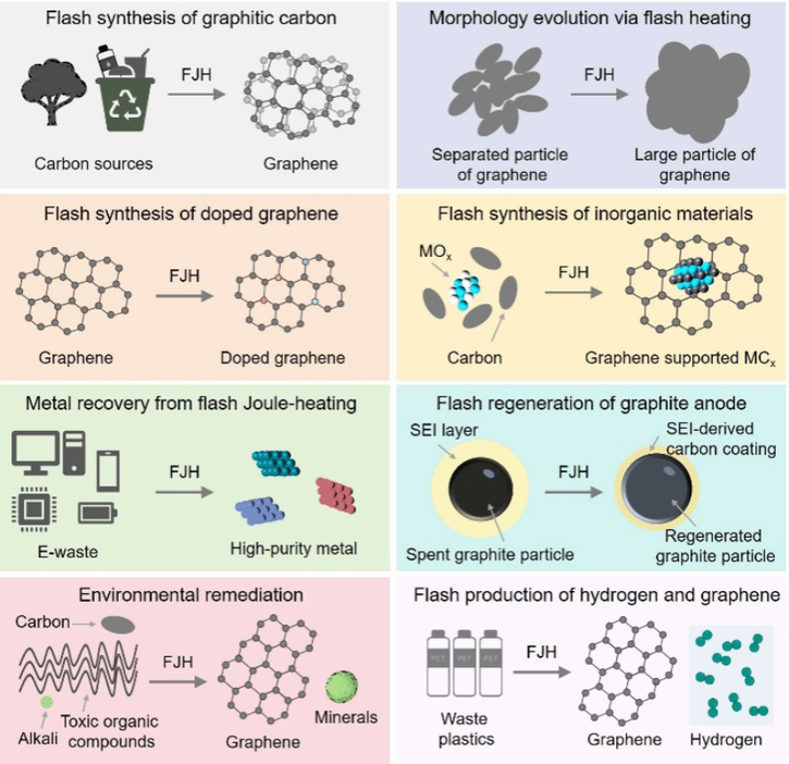 前沿材料制备技术——闪蒸焦耳加热(Flash Joule Heating, FJH)因其碳足迹极低、高效节能的显著优势,正从实验室研究快速迈向产业化应用前沿,引发学术界与工业界的广泛关注。这项革命性的电热加工技术,凭借其独特的工作原理与巨大潜力,被认为有望重塑未来高端材料的生产格局。FJH技术的核心在于利用瞬时、高强度的电流脉冲,将导电原材料在毫秒级时间内急速加热至3000开尔文以上的极端高温。这种超快升温和非平衡过程能驱动材料发生剧烈的物理化学转变,从而高效制备出一系列具有特殊性能的新材料。目前,该技术已在石墨烯制备、废弃物高值化转化、高性能材料合成等多个关键领域展现出广阔的应用前景。随着全球对绿色制造和碳中和目标的追求日益紧迫,FJH技术凭借其近乎为零的直接碳排放、极高的能量利用效率以及工艺简洁性,正迅速演变为可持续材料工程的基石技术之一。