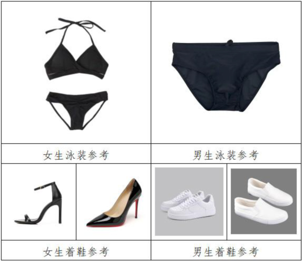 (3)考生按组赤足进行形体形象观测,本组形体形象观测结束后,考生着台步展示考试用鞋(女生着黑色高跟鞋、男生着纯白色板鞋,详见参考图)进行台步展示。