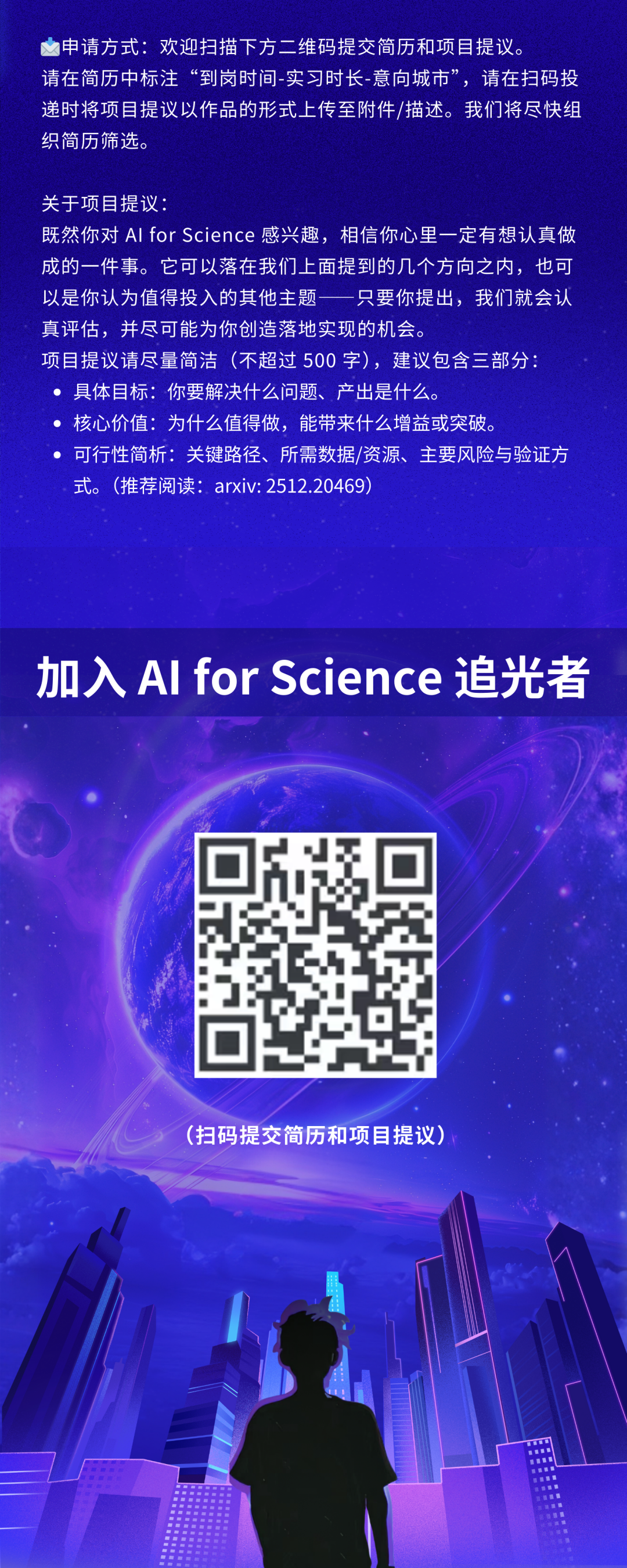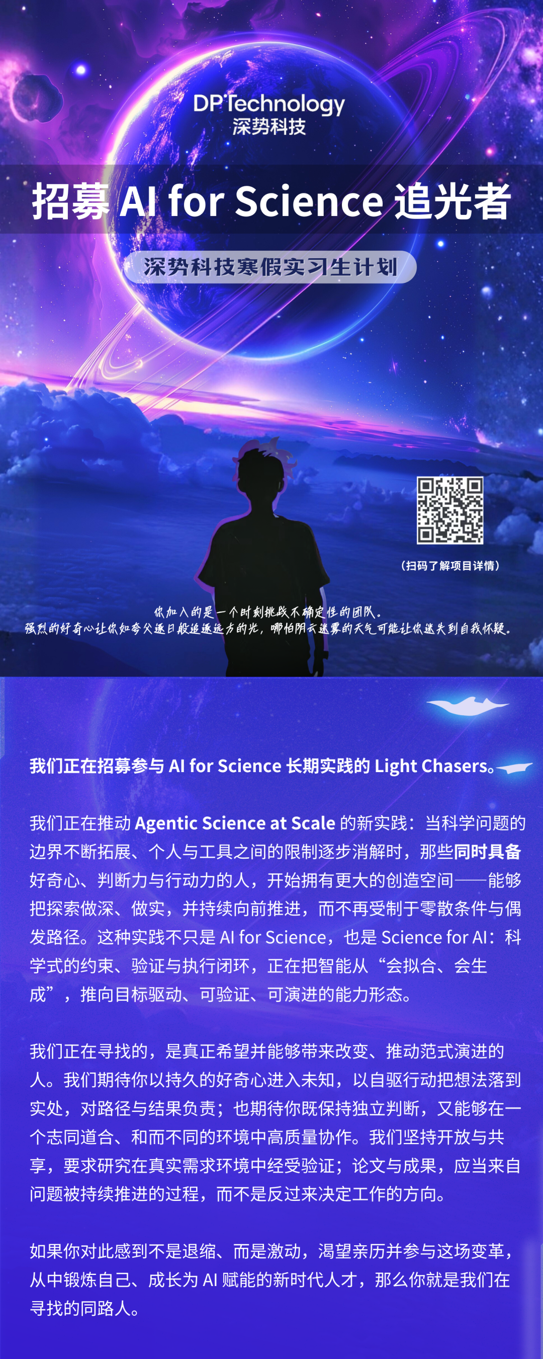 深势科技是全球 AI for Science 的开拓者和引领者,公司成立于2018年,在北京、上海、深圳、宜宾等地设有办公室和研发中心。以“加速科学发现,释放科学价值”为使命,致力于打造 AI 科学家(AI Scientist)及自主进行科学发现的智能系统。以深势·宇知®科学发现智能引擎为基座,深势构建了一系列“读文献、做计算、做实验”的智能科学工具,和各领域的科学智能体,构成了 Science as a Service 智能化科研产品和服务矩阵:玻尔·科学导航,玻尔·勒贝格智算以及 Hermite®、Piloteye®等一系列研发软件,玻尔·赛博实验室,SciMaster 科学智能体及面向科学发现的“大装置”和研发服务,为基础科研、生命科学、物质科学等领域的科学家和研发型组织提供深宽兼顾、灵活组合的解决方案。作为国家高新技术企业、国家专精特新“小巨人”企业,深势科技科研技术团队由中国科学院院士领衔,汇集了超百位数学、物理、化学、生物、材料、计算机等多个领域的优秀青年科学家和工程师,其中博士及博士后在公司成员中占比超过35%。2020年,深势科技核心成员获得全球高性能计算领域的最高奖项“戈登贝尔奖”,相关工作入选2020年中国十大科技进展和全球 AI 领域十大技术突破。