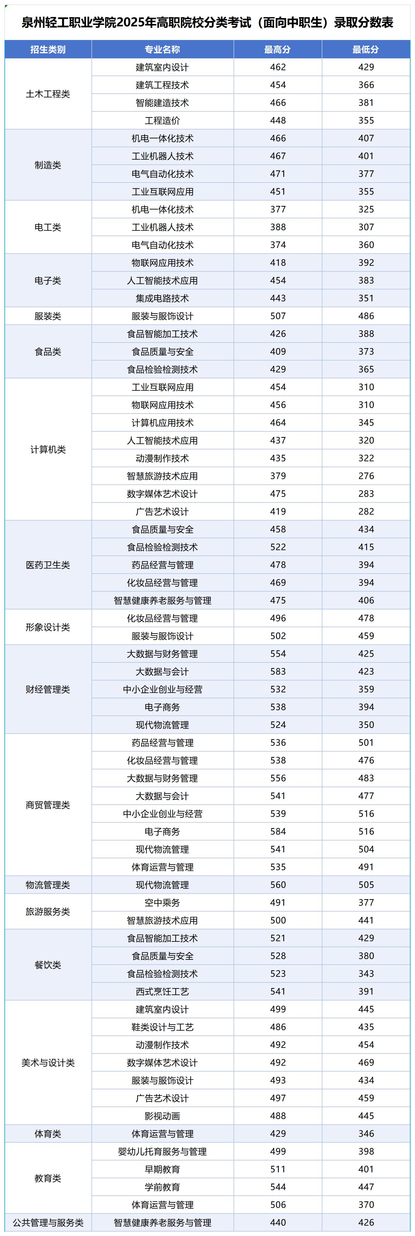泉州轻工职业学院2025年高职分类考试面向中职生录取分数表