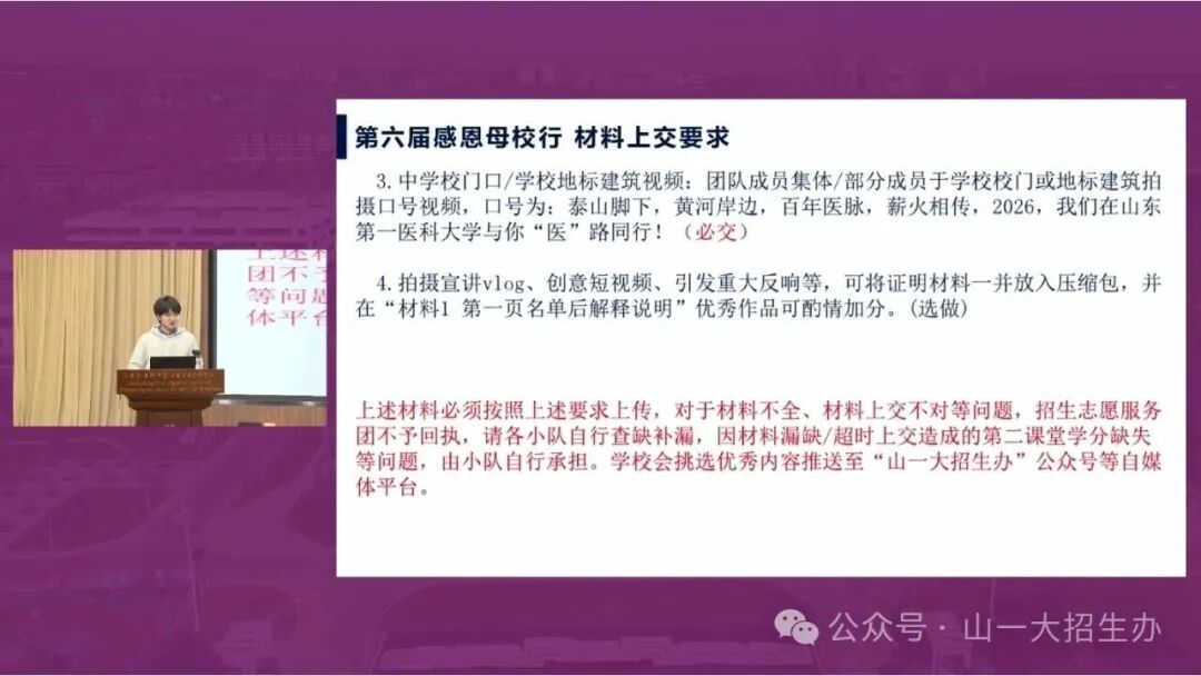 随后,第六届“感恩母校行”活动总队长、招生志愿服务团主席(济南校区)闵菊同学做示范讲解,通过全面展示校(院)历史沿革、校园风光、学科建设、科研成果、名师风采、文化活动等,讲述“选择山一大的十大理由”,与队员们分享如何彰显校(院)综合实力与独特魅力。