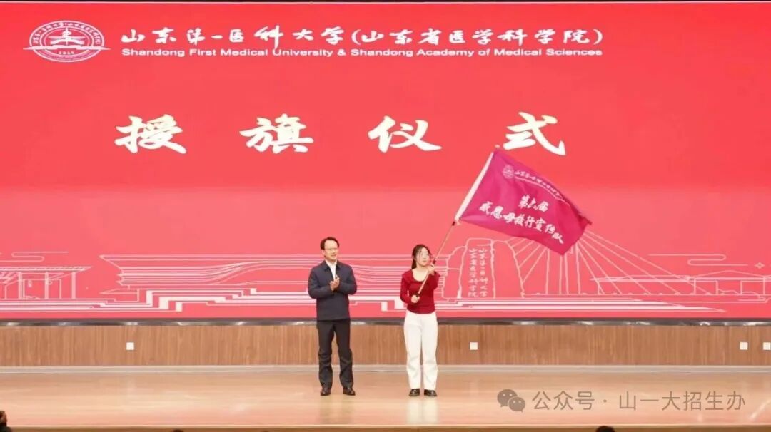 校(院)党委委员、副校(院)长贾海宁向本次活动总队长—2023级临床药学2班闵菊同学授“山东第一医科大学感恩母校行”实践活动队旗,此举既为实践活动正式启航,也激励学子以感恩之心践行使命,传承校友情谊与治学精神。
