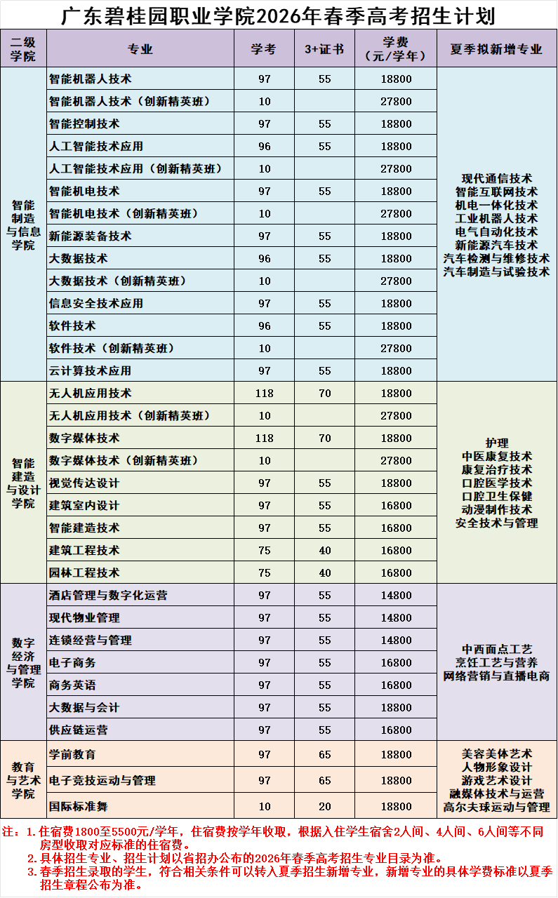广东碧桂园职业学院2026年春季高考招生计划