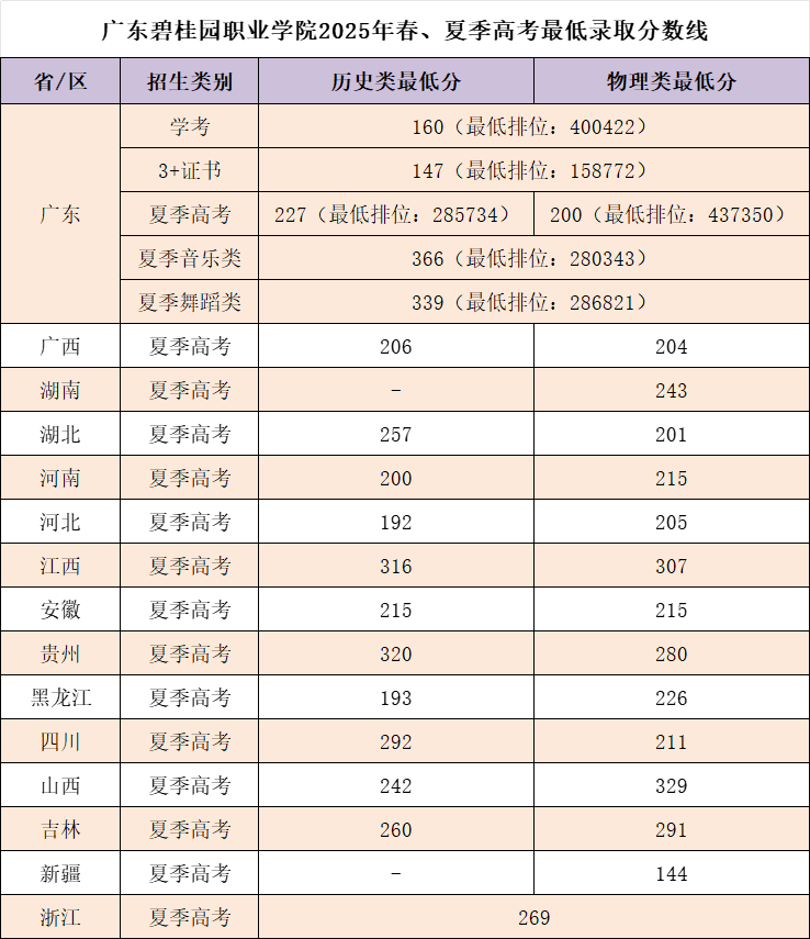 广东碧桂园职业学院2025年春、夏季高考最低录取分数线