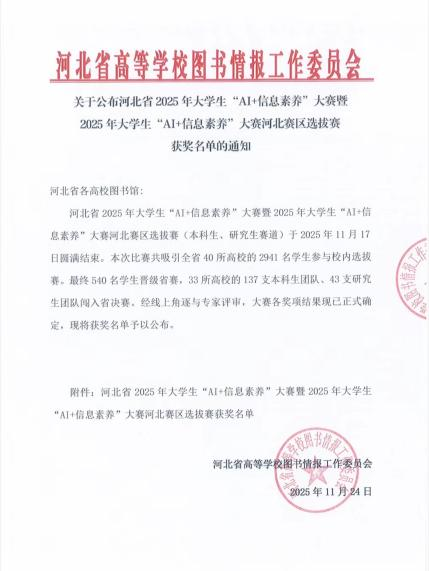 本届大赛由教育部高等学校图书情报工作指导委员会指导、大学生“AI+信息素养”大赛组委会主办,共吸引全国1243所高校、27.38万名学生报名参赛。在河北省赛区中,共有40所高校展开激烈角逐,经过校赛、省赛淘汰赛层层选拔,最终137支队伍晋级决赛。