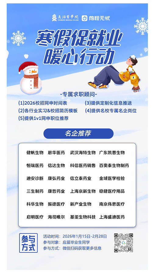 各位同学: 寒假如约而至,梦想步履不停。当冬日的暖阳洒满校园,我们也迎来了这场满载关怀与期许的“寒假促就业暖心活动”。毕业的钟声虽未敲响,但求职的征途已然开启 —— 我们深知,每一位怀揣理想的学子,都渴望在寒冬中握到一束照亮前路的光;每一份跃动的简历背后,都藏着对未来的无限憧憬。 为此,我们携手前程无忧、联动多方资源,搭建起这场暖心之桥。在这里,有精准匹配的岗位信息,有行业前辈的经验分享,有求职路上的专属指导,更有一路相伴的温暖支持。本次活动为大家提供优质企业岗位,专属名企内推、专属导师1v1、提高学生简历制作水平、行业选择敏感度、岗位匹配精准度、面试熟练度和技巧性,同时增加广大毕业生获得优质offer的机会。一、面向对象应届毕业生二、活动时间2026年1月15日~ 2026年2月 28日三、参与方式 扫描海报二维码添加前程无忧企业微信参与活动。
