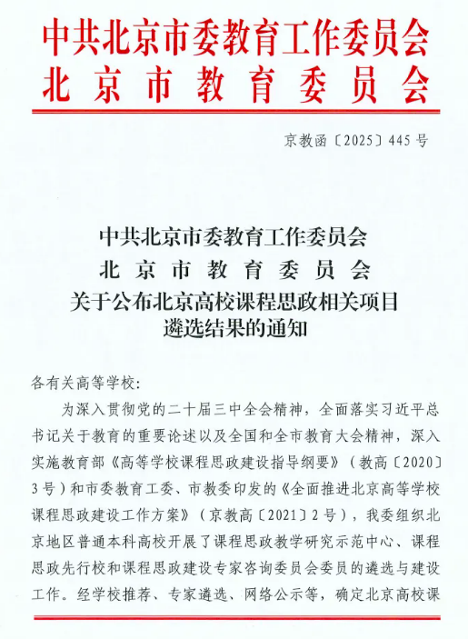 学校成功获评“北京高校课程思政先行校”与“北京高校课程思政教学研究示范中心”两项市级重要荣誉,标志着我校协同育人能力与课程思政建设水平迈上了新的台阶。